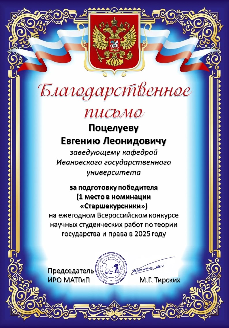 2025 г. – Диплом победителя Международного конкурса «Научная книга» 2025 г. - I место в номинации «Историко-правовые исследования» за книгу «Советское право и его применение в период Великой Отечественной войны» / отв. ред. Е.Л. Поцелуев. Иваново: ИвГУ, 2025. 192 с. (один из соавторов книги). Академия управления МВД России.