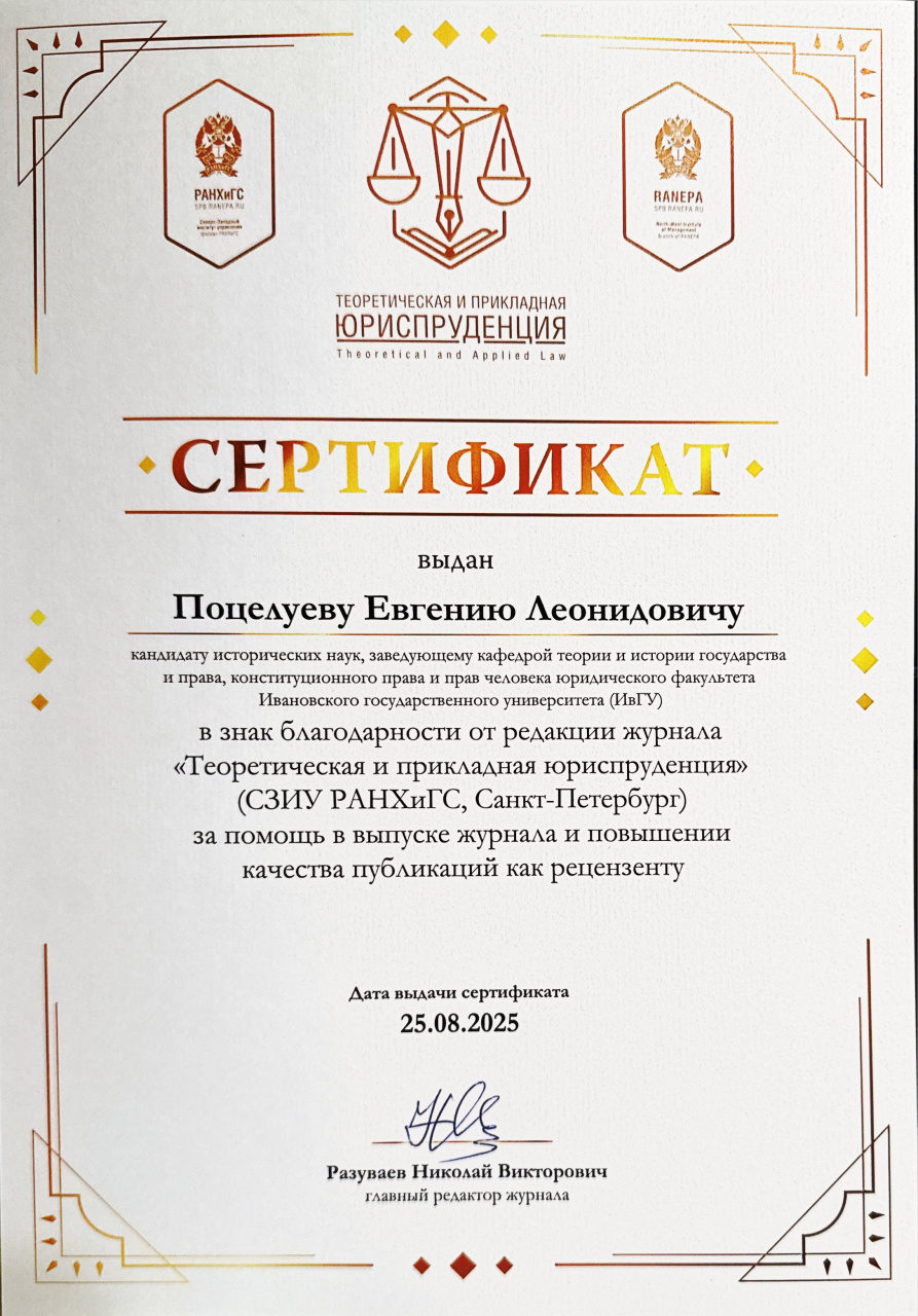 - Поцелуев Е.Л. Предисловие // Советское право и его применение в период Великой Отечественной войны / коллективная монография / отв. ред. Е. Л. Поцелуев. — Иваново : Иван. гос. ун-т, 2025. С. 5-26. РИНЦ https://elibrary.ru/item.asp?id=82809374 (дата обращения: 13.11.2025).