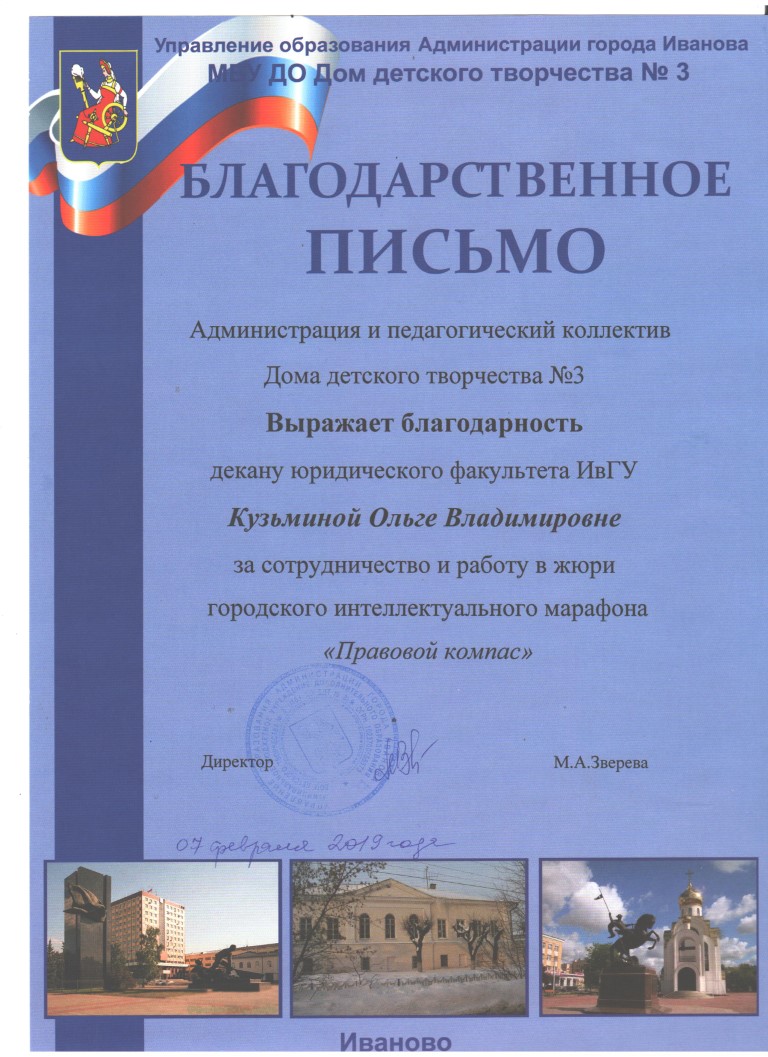 7 февраля 2019 года Управлением образования Администрации города Иваново и МБУ ДО «Дом детского творчества № 3» был проведен городской интеллектуальный марафон «Правовой компас». В нем приняли участие 17 команд из ивановских муниципальных образовательных учреждений: МБОУ СШ № 2, 5, 11, 23, 28, 41, 49, 50, 53, 56, 63; МБО Лицеи № 22, 33, 67; МБУ ДО ДЮЦ № 1; МБУ ДО ДДТ № 3 и ЦВР № 2.