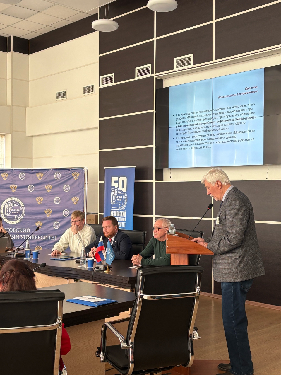 Открыл школу-конференцию сопредседатель организационного комитета, доктор химических наук, профессор Михаил Васильевич Клюев. В приветственном слове ректор ИвГУ Алексей Александрович Малыгин отметил важную роль научных школ в развитии вузовской науки и в усилении мотивации студентов к выполнению научных исследований. Проректор по науке и инновациям ИГХТУ Андрей Андреевич Гущин поблагодарил гостей, прибывших на ивановскую землю из разных городов нашей большой страны. Сопредседатель организационного комитета, доктор химических наук, профессор Георгий Васильевич Гиричев рассказал собравшимся о непростом жизненном пути и научных достижениях профессора Константина Соломоновича Краснова, памяти которого посвящена конференция.