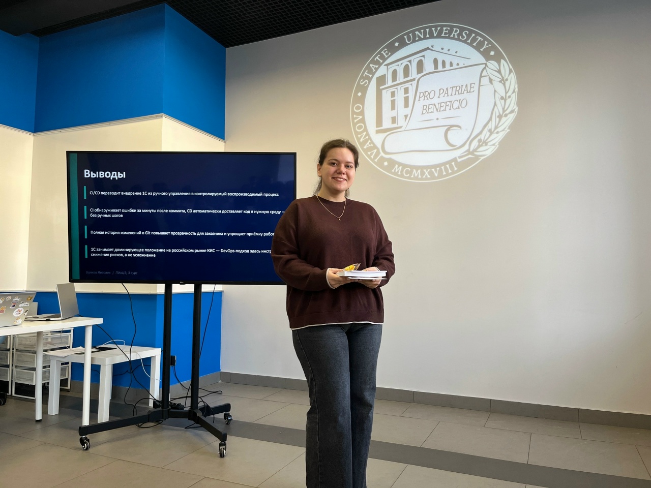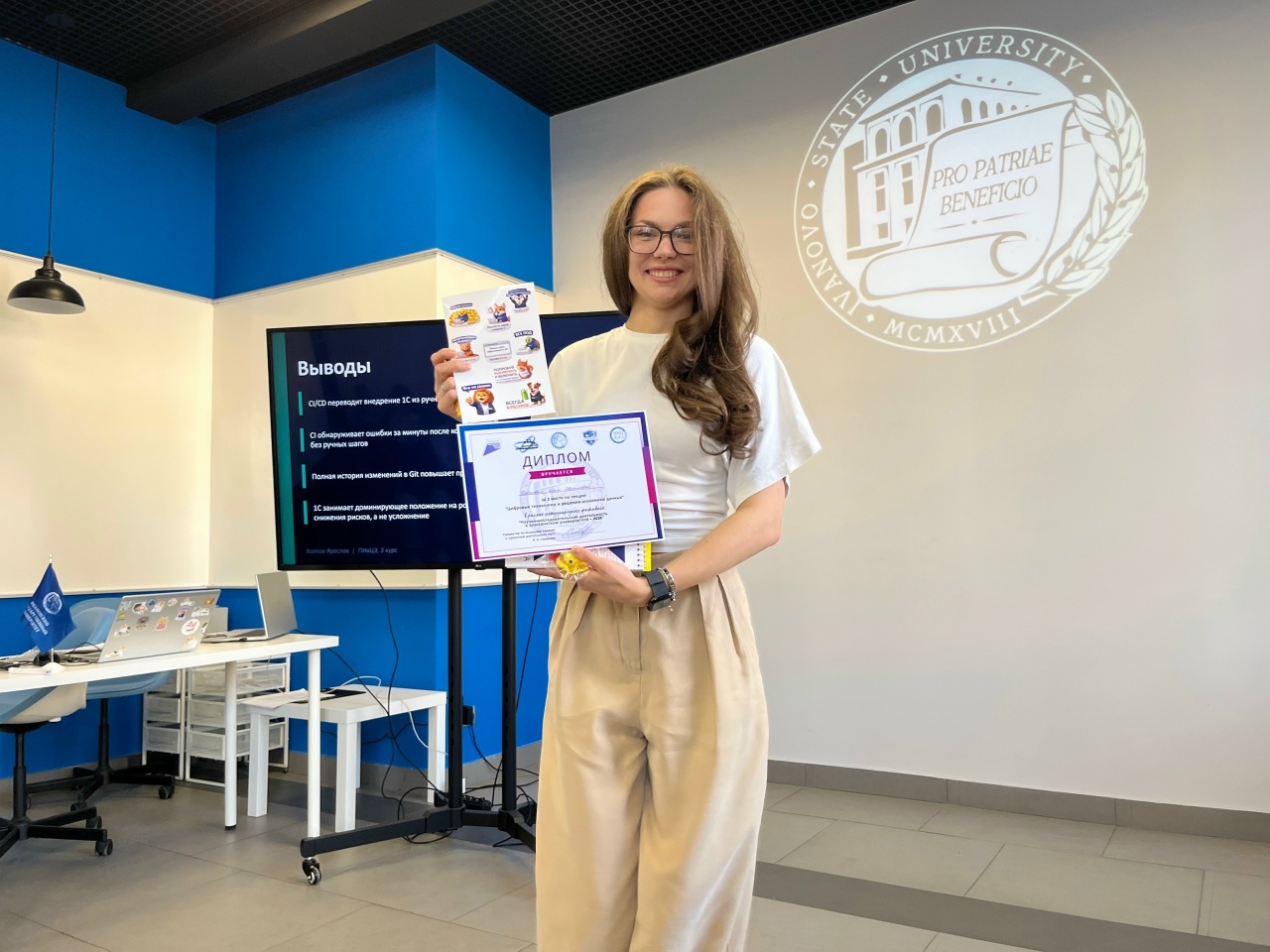 2-е место жюри присудило третьекурснице Ольге Бобковой за проект о роли ИИ в обучении студентов. 3-е место заняла Анна Котлова, которая подвела итог использованию ИИ в различных сферах и подняла актуальный вопрос про иллюзии от применения ИИ.