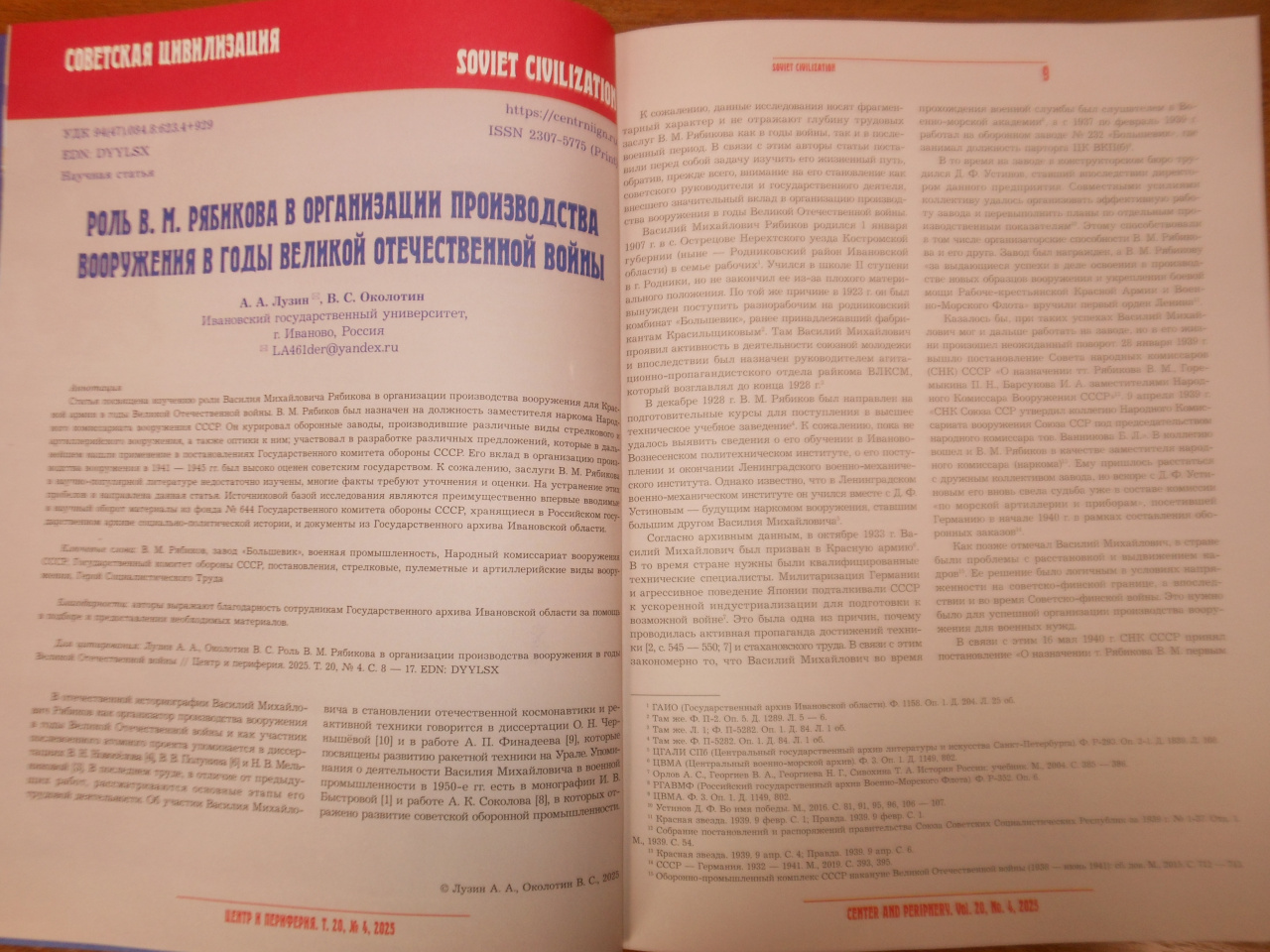 Александр Лузин, магистрант-историк 2-го года обучения, представил к публикации в авторитетном российском научно-публицистическом журнале «Центр и периферия» (2025, том 20, № 4) своё новое исследование, которое посвящено изучению роли Василия Михайловича Рябикова в организации производства вооружения в годы Великой Отечественной войны (1941-1945гг.).